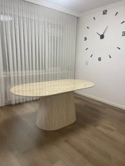 Demarmeren eettafel met een ovaal vorm in travertin kleur is een luxe centerpiece voor iedere moderne eetkamer. Dankzij het ovale marmeren blad, het solide design en de warme travertin structuur geeft deze tafel direct een exclusieve uitstraling aan jouw interieur. Deze marmeren eettafel met een ovaal design combineert elegantie met functionaliteit en past perfect binnen zowel moderne, minimalistische als hotel chique interieurs.